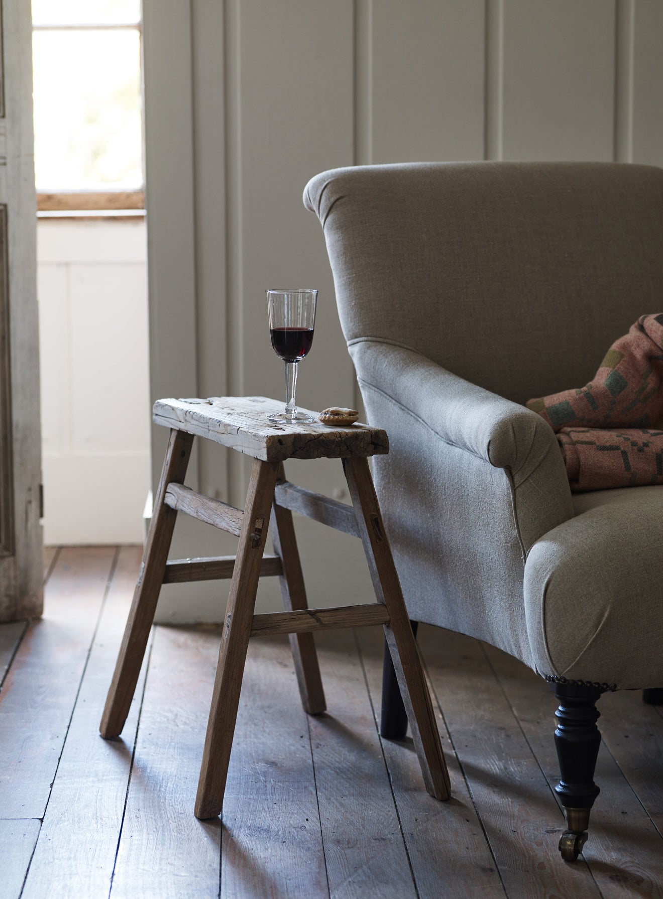 - Un meuble en bois vieilli, inspiré des tabourets de laiterie d'autrefois