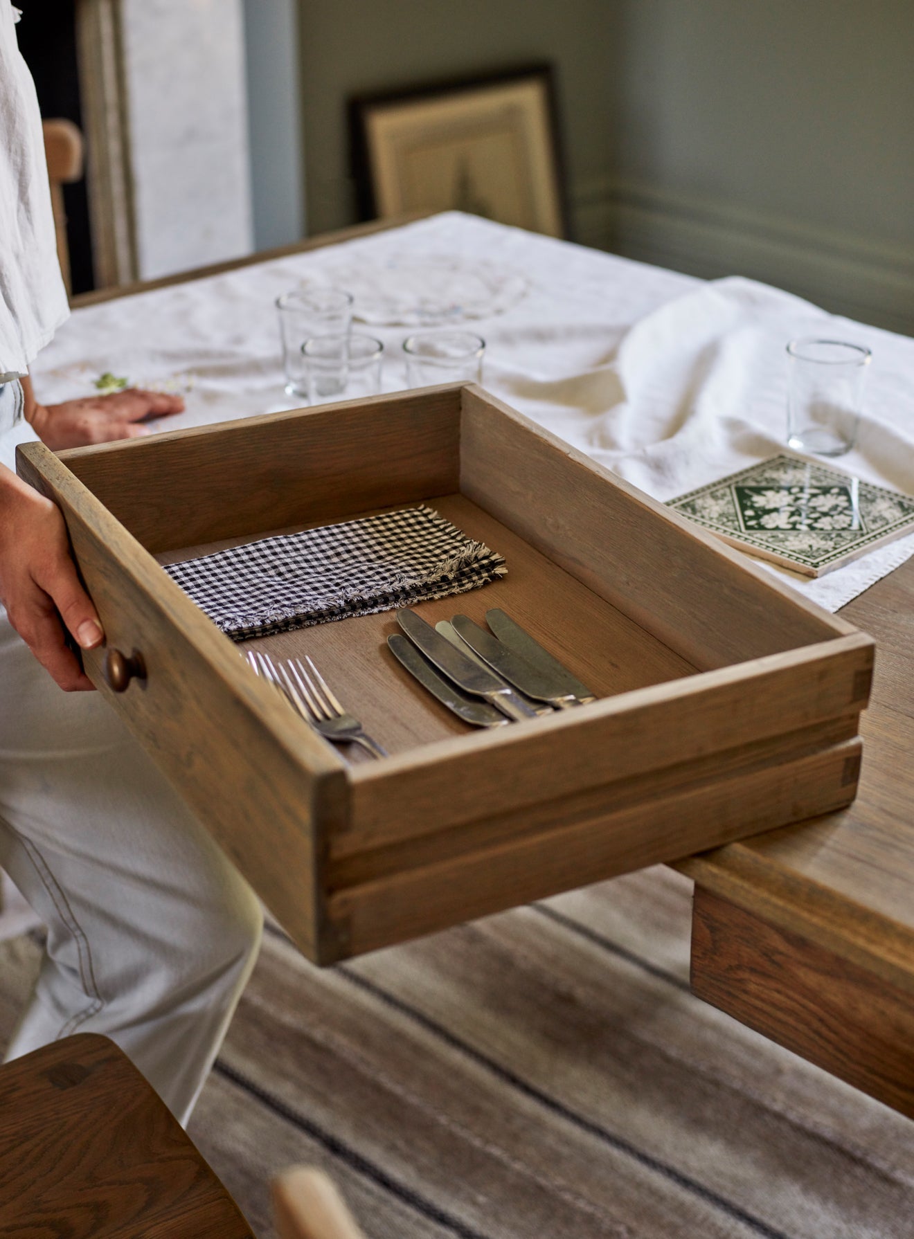 - Une table à manger en bois classique inspirée des meubles anciens de fermes anglaises