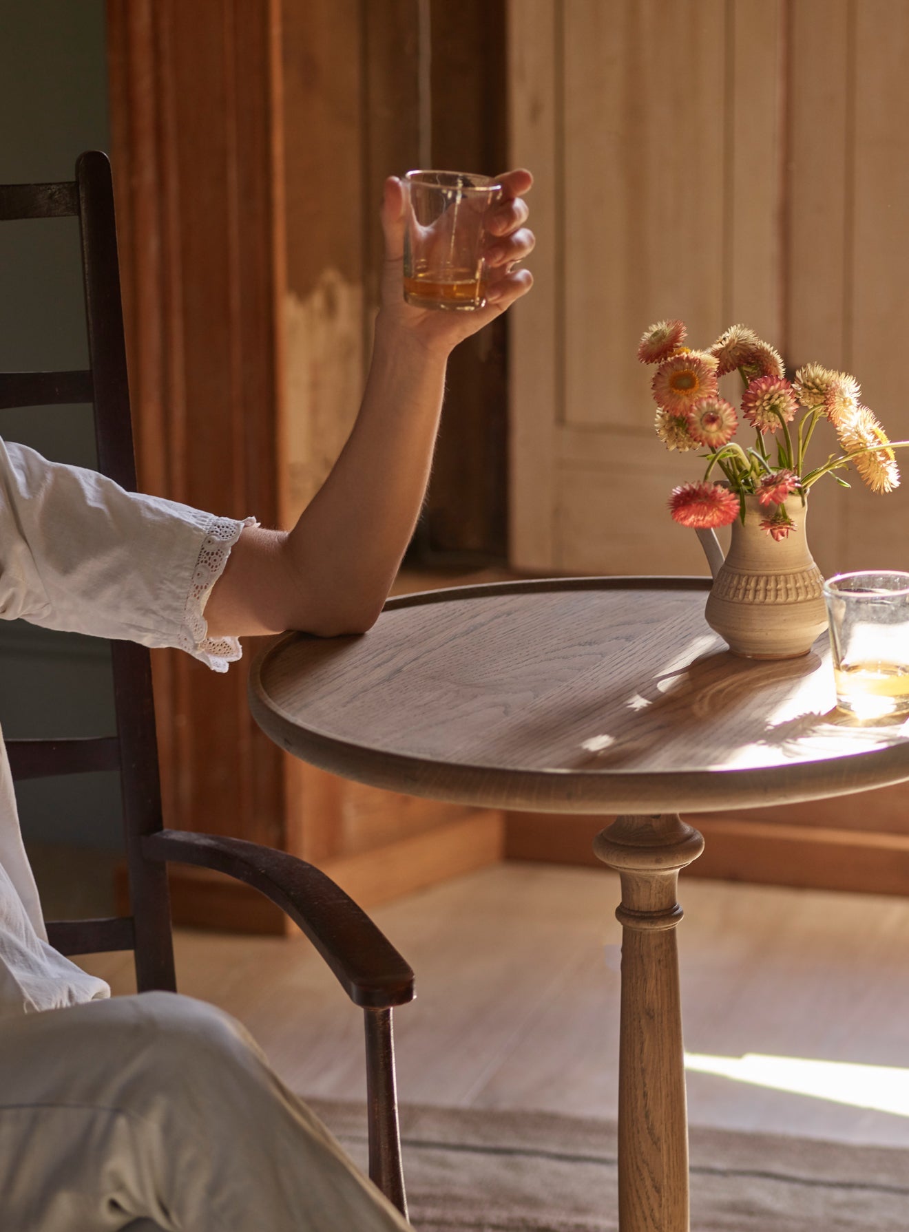 - Une table d'appoint ronde en bois inspirée des tables d'appoint d'antan
